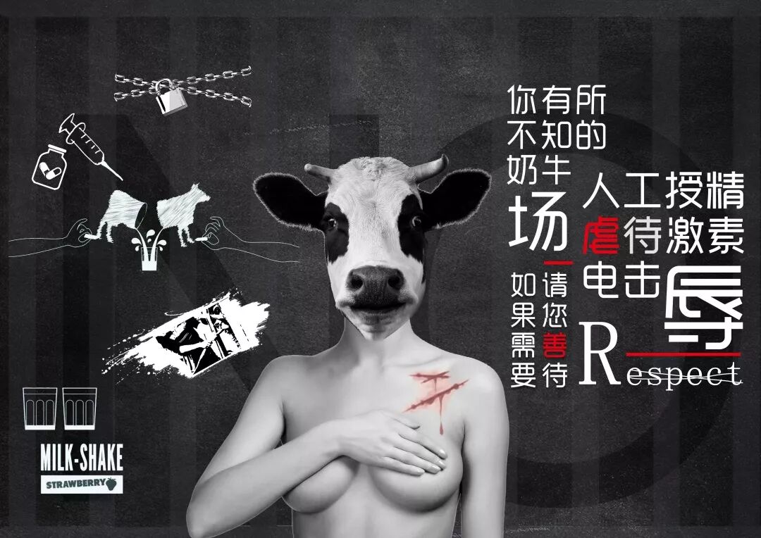 第一张广告主体为一个长着奶牛头的女人,用女人来隐喻奶牛在奶牛场所受的苦难,背景为牢狱形状,同时英文“NO”浮现在上,整个图的左右两部分分别用抽象图和文字将奶牛场里人类的“罪行”展现出来,告诉人们Respect的重要性,图中Respect的后半部分被勾掉,剩下一个字母“R”,正隐喻现在人们的所作所为——“辱”。这个广告就是想让人们不要勾掉Respect的后半部分,还奶牛一个对生命的尊重。