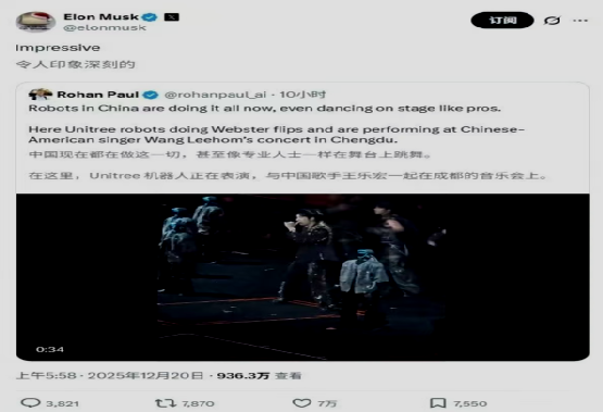 这一动态,竟让埃隆·马斯克都坐不住了。12月20日,他亲自转发评论Impressive,这一键之力,引发海外关注量超4000万,外国网友惊呼:中国科技太超前。