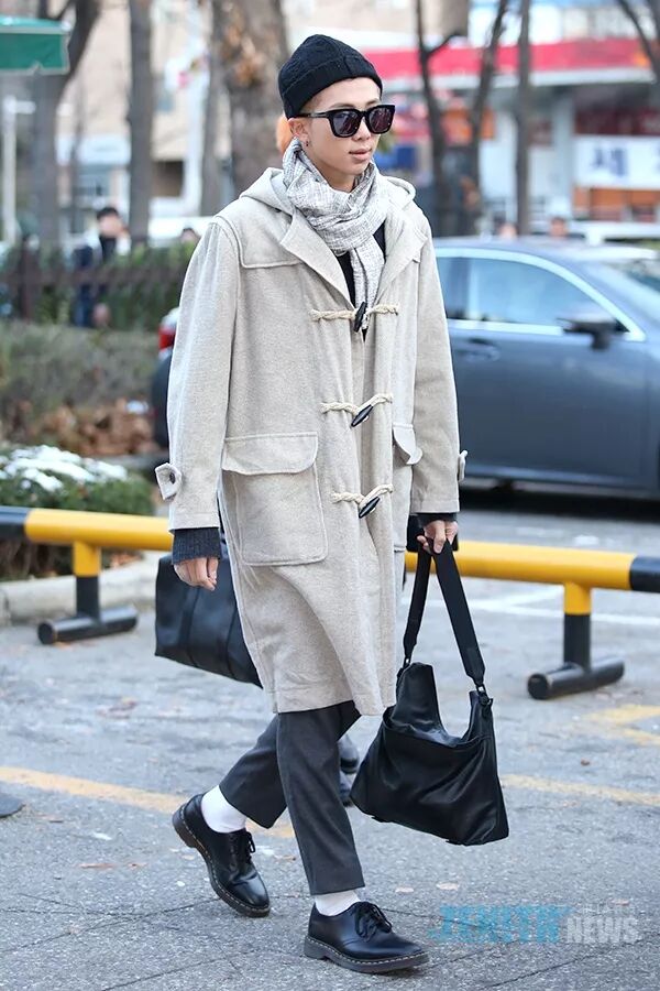 牛角扣外套并不是女生的专属,防弹少年团成员RM就以一件灰棕色的长款牛角扣外套打动女心。