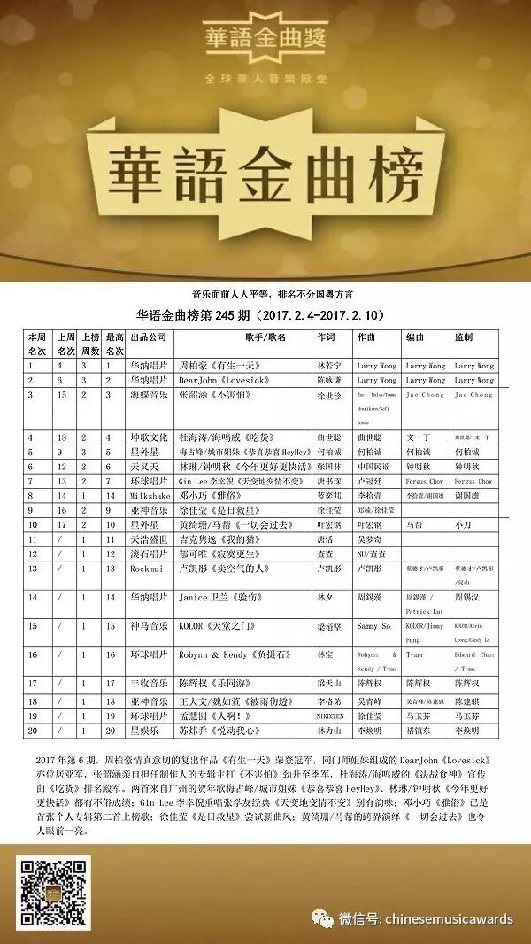 亦位居亚军,张韶涵亲自担任制作人的专辑主打《不害怕》劲升至季军,杜海涛/海鸣威的《决战食神》宣传曲《吃货》排名殿军。两首来自广州的贺年歌梅占峰/城市姐妹《恭喜恭喜HeyHey》、林琳/钟明秋《今年更好更快活》都有不俗成绩;Gin Lee李幸倪重唱张学友经典《天变地变情不变》别有韵味;邓小巧《雅俗》已是首张个人专辑第二首上榜歌;徐佳莹《是日救星》尝试新曲风;黄绮珊/马帮的跨界演绎《一切会过去》也令人眼前一亮。