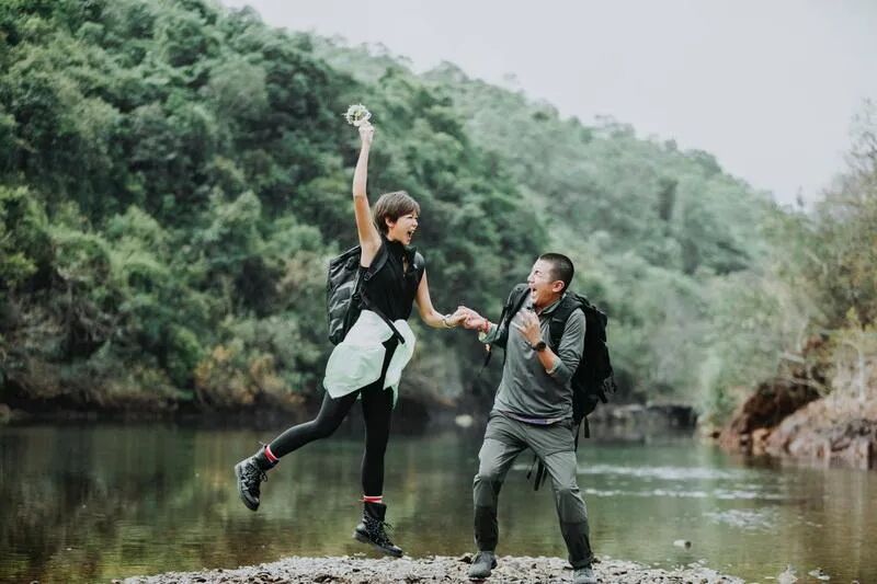 洪永城(Tony)与梁诺妍(Inez)拍拖3年,早已共赋同居,两人今日正式宣布「我哋要结婚啦」,并在社交平台公开早前秘密拍摄的创意搞笑结婚照﹗Tony和Inez都热爱运动,连结婚照也充满动感,其中一张是他们在运动场上跃起的照片,另一款则是二人在湖边的温馨鬼马相,他们一身背包行山造型,双手紧握在一起,寓意从此手拖手,一起笑住过。