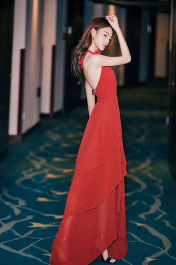 同样的一身红裙的她看起来就像是华中走出来的仙子一样,露背设计性感迷人,精致小巧,配上一双高跟鞋,十分性感,独特的裙身设计也让她拉长了身材比例,看着腿长一米八的感觉,自然流畅的线条十分和谐!