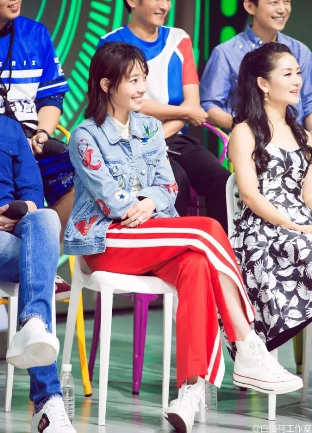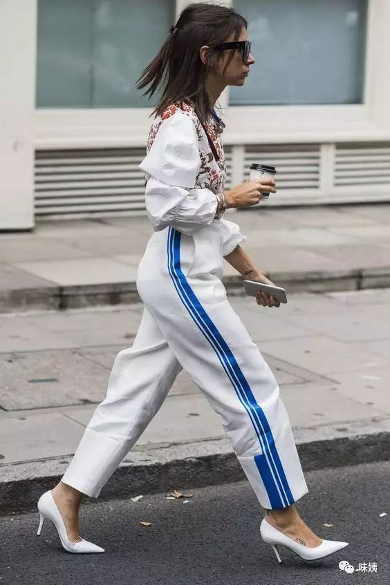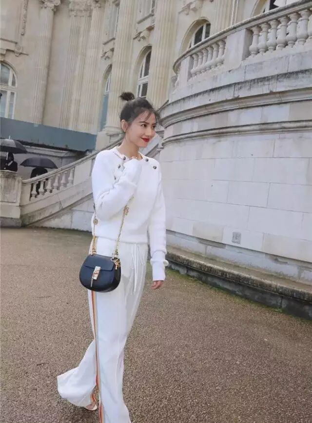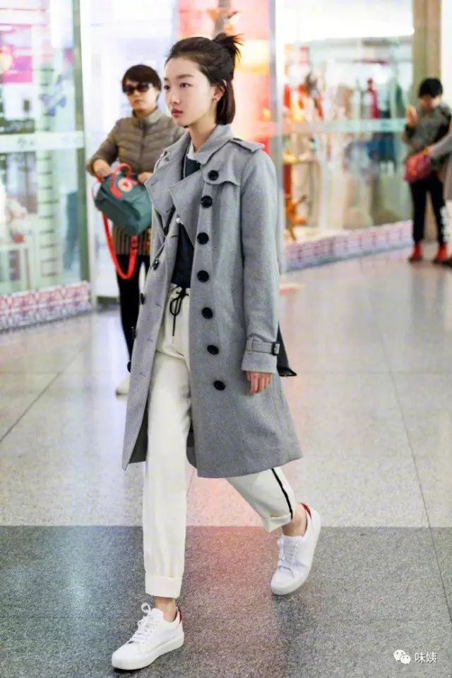 这半年来很流行的校服裤,女神很早就穿上了,白色毛衣搭配白色校服裤,一身白很高级,阔腿的裤管设计完全让小粗腿“躲”了起来。