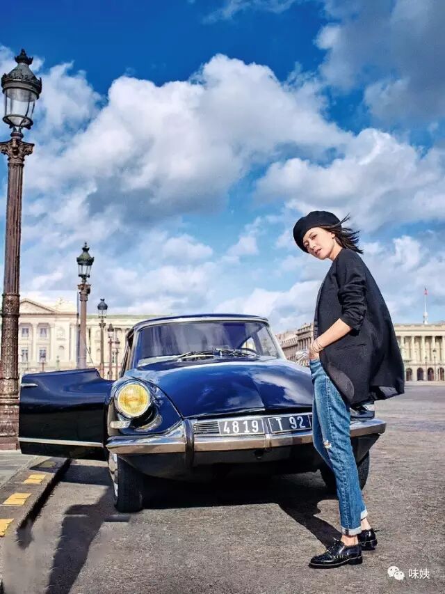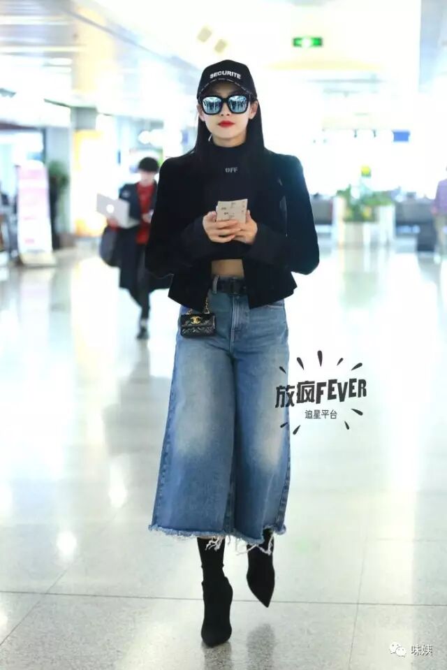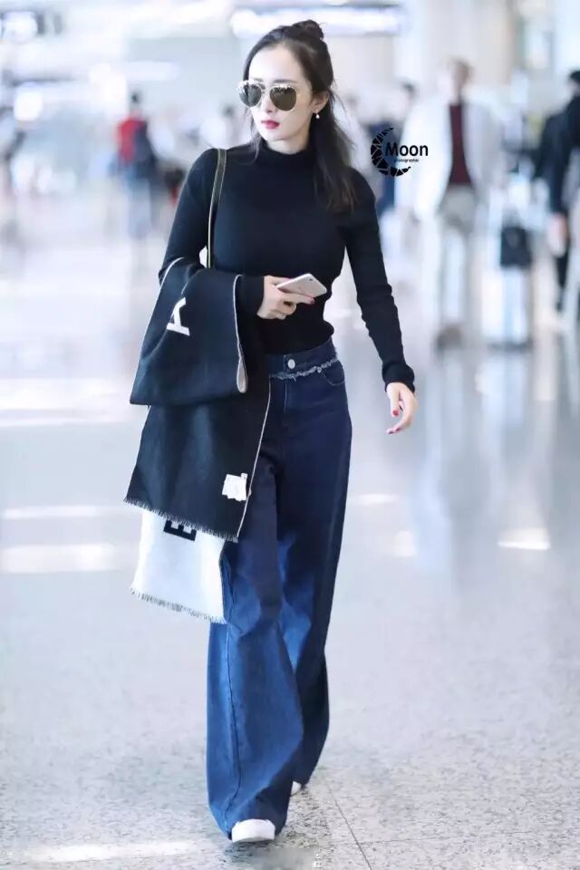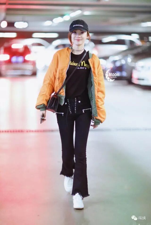 黑色高腰喇叭裤,搭配短夹克,脚踩高跟鞋,小粗腿也变身大长腿.肩背的黄色包包,打破了黑色的无聊,而一顶黑色软呢帽,更是给造型加分。