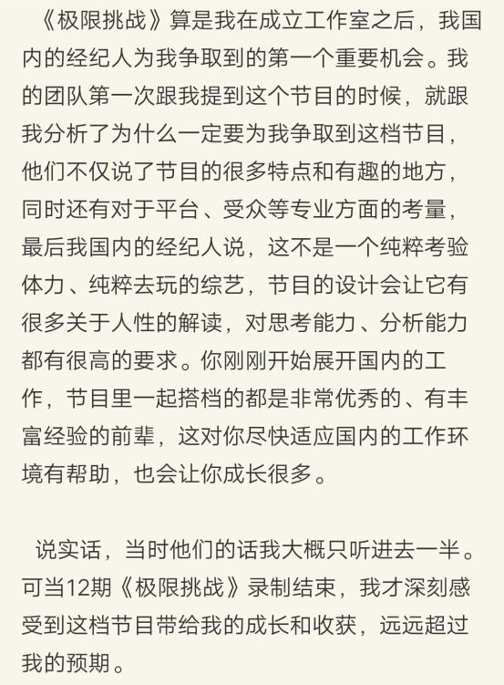 《极限挑战》是张艺兴成立工作室后,国内经纪人为他争取到的第一个重要机会,当时张艺兴并不明白这个节目对他来说意味着什么,经纪人反复和他分析参加节目的好处,从观众缘到节目定位,到合作嘉宾,都进行了解读,最后劝说了张艺兴来参加。
