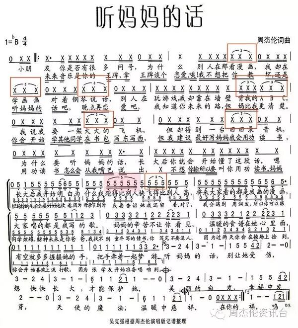 7、切分音狂魔……修饰音狂魔……多连音狂魔……简称就是炫技狂魔。小生当年试图过抓他的一些歌的节奏,然后和节拍怎么都对不上,看了之后才发现是切分音……而且他有一个他独有的创新:将重拍放在修饰音上(修饰音就是那种极短的迅速的一闪而过的音节,叮铃一下的感觉,是为了乐句加花而用的),代表作品是《骑士精神》第二段主歌里的“他们的语气,好笑的攻击,自卑的心理”,语气,攻击,心理等这几个词都迅速的一闪而过,而且不占拍子(应该是吧),但是重拍却都放在他们身上。哇,那震撼,那酸爽,那叼炸天……我没见别人用过(敢用过)。多连音更是……代表除了前边提到的《龙卷风》,还有一首大家都非常熟悉的《听妈妈的话》,噢,3连音一堆!甚至还有五连音!上一张图,大招已经大致标注了。