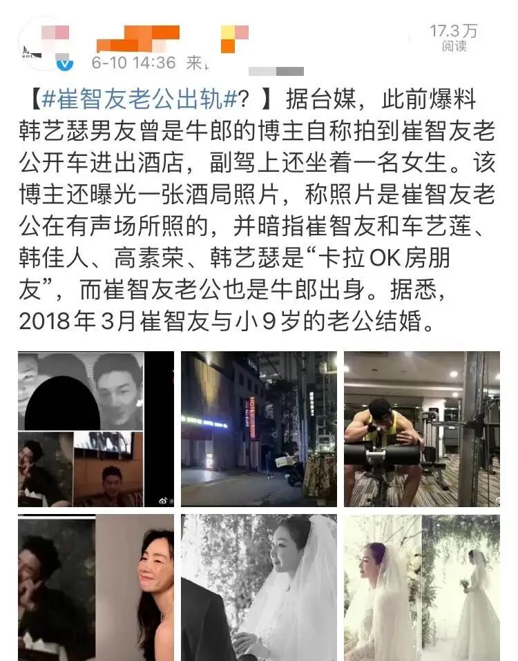 据报道,有一名退休的娱乐记者在网上爆料崔智友老公夜会女生,疑似出轨。