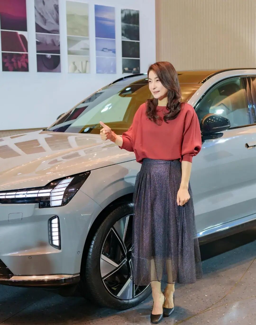 广州车展一身红衫配纱裙,没有珠光宝气,却稳站C位;