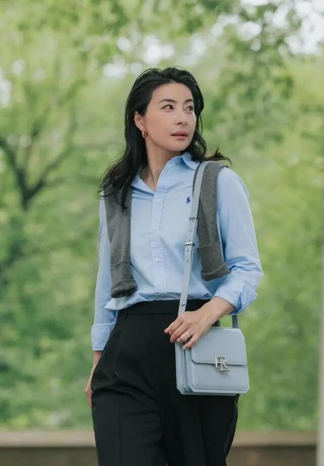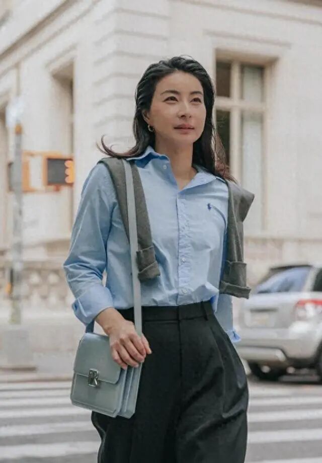 香港街头蓝衬衫+黑阔腿裤,一身基础款,被全网夸"40+女性穿搭模板";
