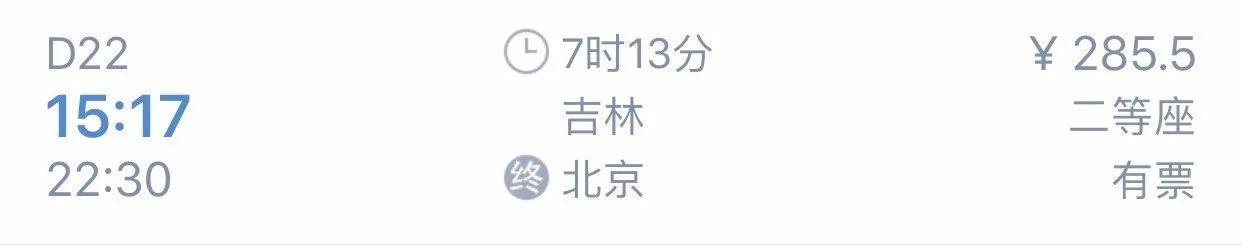 吉林--北京(D22,二等座285.5元,约7小时,晚上22::30到