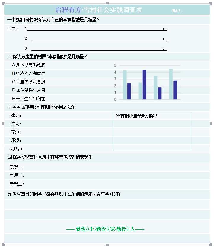 雪村社会实践中,我们的小伙伴将以小记者的身份,零距离接触最淳朴的民风,最感人的故事,最真实的人生,在这里我们将调查了解村民的幸福指数,了解城市与乡村的不同,以及了解不同地域的孩子们对学习的看法与态度,同时用慧眼考察这里人们所独有的好品质。