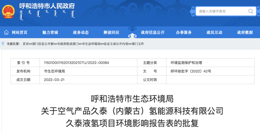 近日,呼和浩特市生态环境局发布关于空气产品久泰(内蒙古)氢能源科技有限公司久泰液氢项目环境影响报告表的批复。