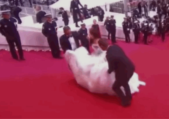 不过这场红毯的“名场面”当属Jessica因裙子实在太重、鞋跟太高而走不上电影宫台阶,由两位保安搀扶着她抬着裙子上楼。