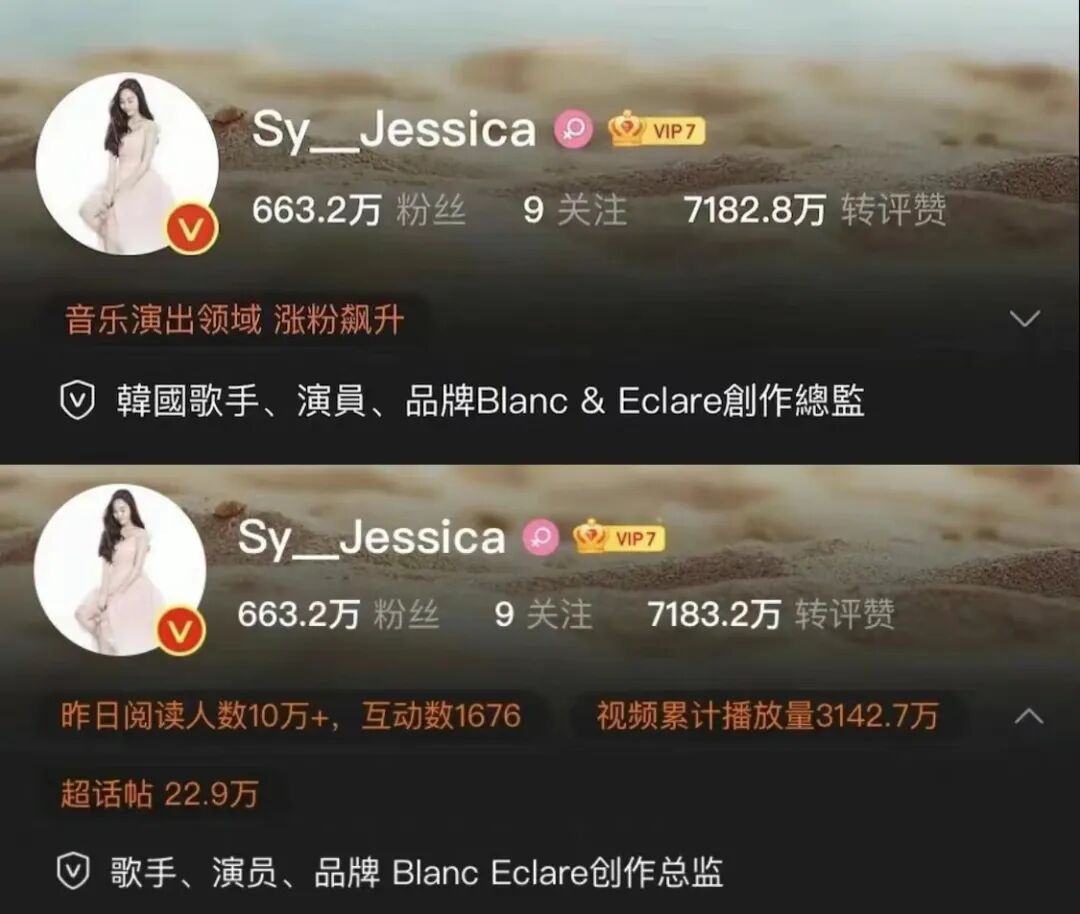 引起争议之后,Jessica索性连夜把微博认证中的韩国悄悄划去,还把认证的繁体字也改成了简体。