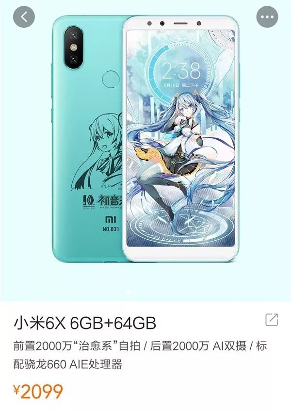 而在昨晚,小米6X初音未来版已经悄悄在官网上架,有网友已经截图并曝出,外观上与普通版没大区别,