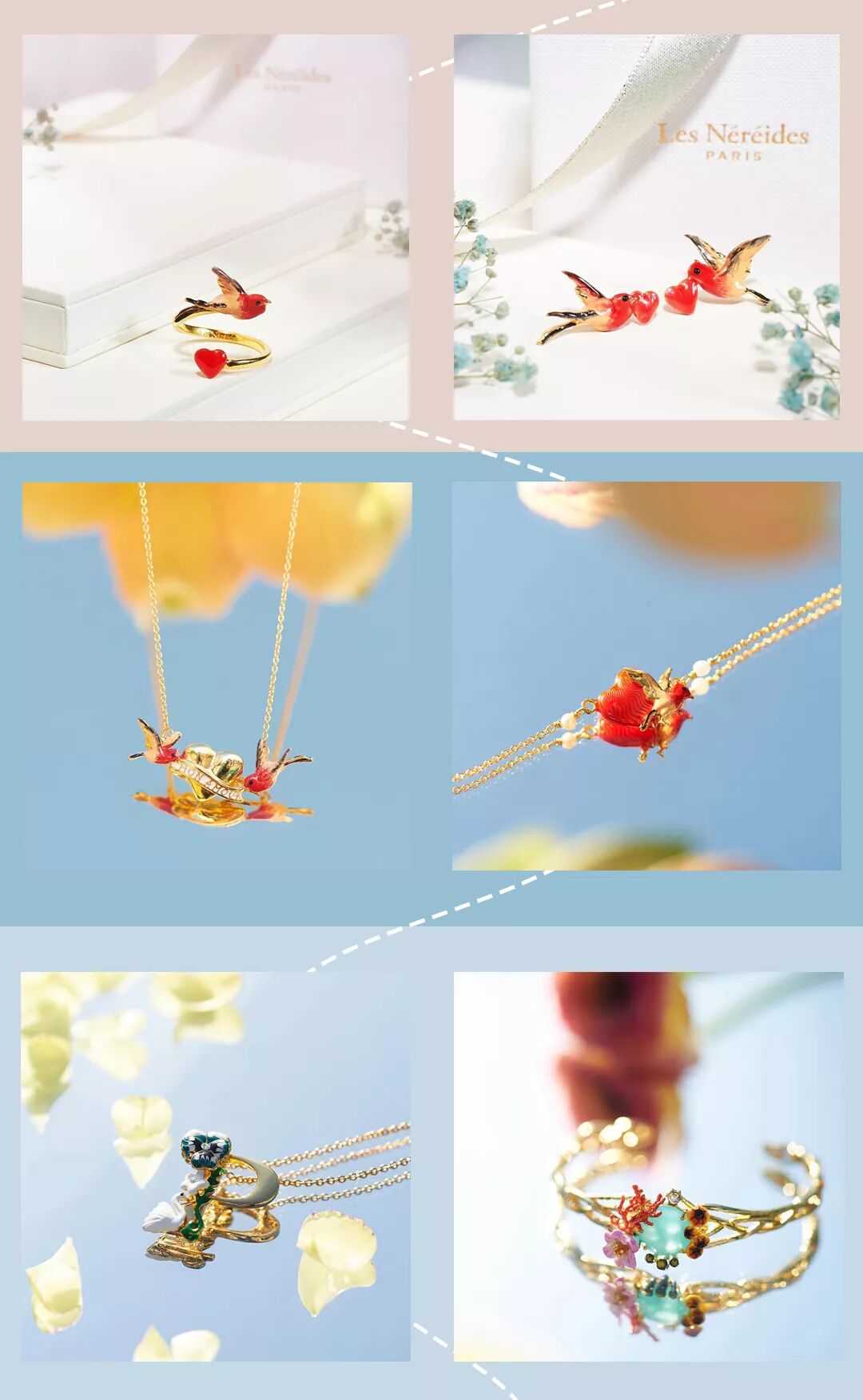 Les Nereides的设计灵感来自雕塑艺术、花朵动物、法式浪漫和童话传说。材质主要是珐琅、水晶、宝石、珍珠等,具有非常典型的法式风情。