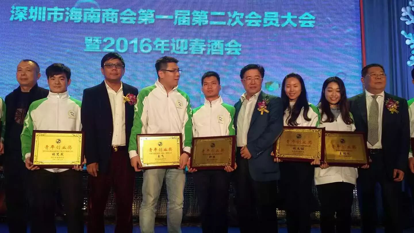 我会执行会长、深圳市海南商会名誉会长韩子劲先生,与深圳市另五位名誉会长王大富、陈枫、张泰超、缪建生、云海清,一同为获得“青年创业奖”获奖者颁奖。
