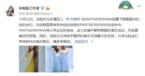 近日,韩国PARTNERS park公司公开表示:“未来将全力支持朴智妍在韩国的演艺活动,同时,龙桢文化也将会继续给予她音乐上的支持,请多多期待。”