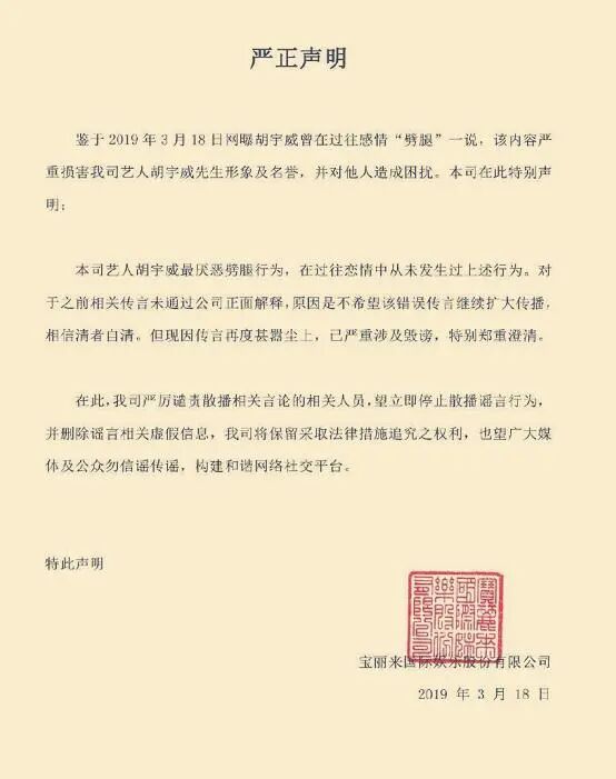 这不,今天宝丽来国际娱乐发了一则声明,否认了旗下艺人@胡宇威 的“劈腿”传闻,并强烈谴责造谣者。