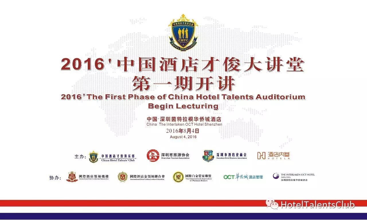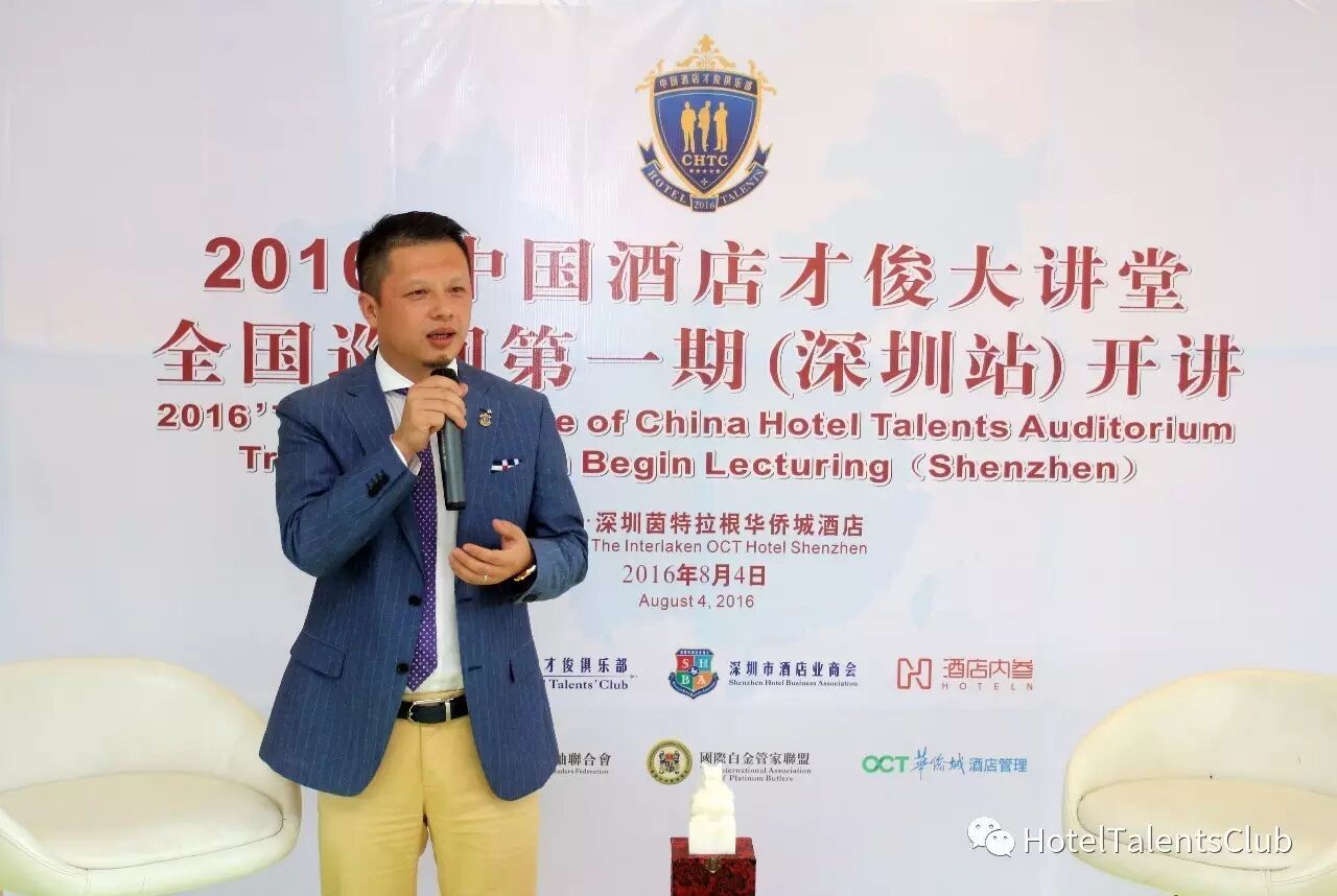 2016年8月4日,由中国酒店才俊俱乐部、深圳市酒店业商会、酒店内参联合举办的2016’中国酒店业第一期【中国酒店才俊大讲堂】(深圳区)在深圳东部华侨城茵特拉根酒店成功举办。