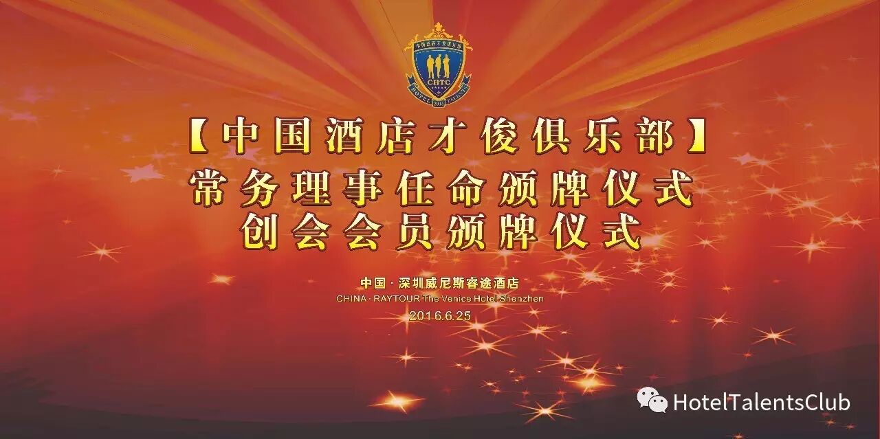2016年6月25日,“中国酒店才俊俱乐部成立大会暨中国酒店才俊TOP100精英论坛”在深圳威尼斯睿途酒店成功举办。