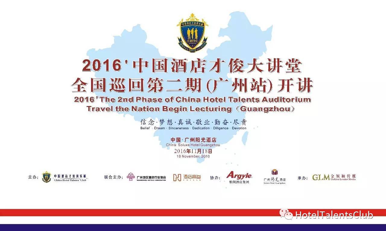 2016年11月18日,由中国酒店才俊俱乐部主办,广州地区酒店行业协会、酒店高参联合主办,雅阁酒店集团、广州阳光酒店协办的全国巡回第二期公益性【中国酒店才俊大讲堂】在广州阳光酒店成功举办。