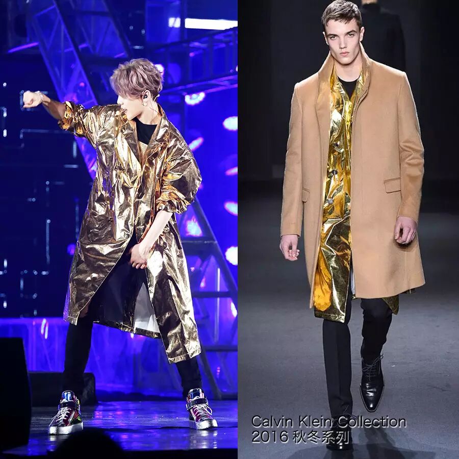 也是没想到,这么骚气的金色长外套,来自CK。