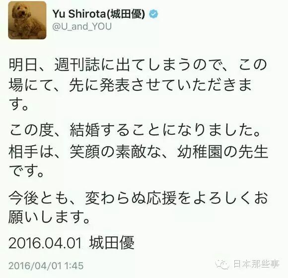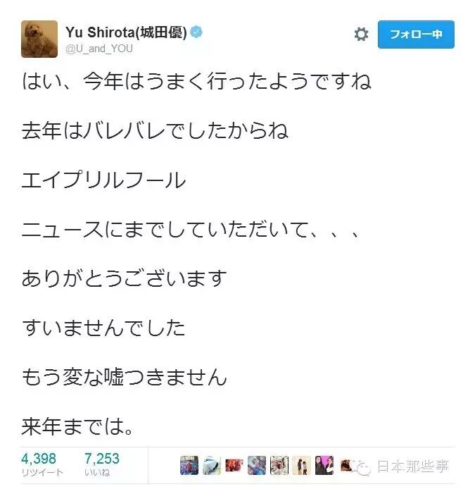 然后,自曝结婚事件以后的今天下午,U君再度发推特解释“确实是愚人节玩笑”惹。