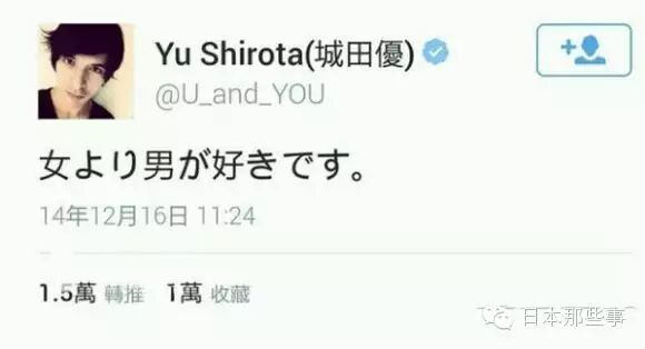 出柜事件之后,城田优随即发推解释称只是酒喝多了感慨男性朋友之间的友谊。