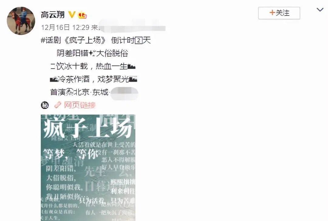 昨天,在工作上沉寂了很久只晒女儿的高云翔,在微博上宣传了自己的新话剧《疯子上扬》↓正式宣告复出。