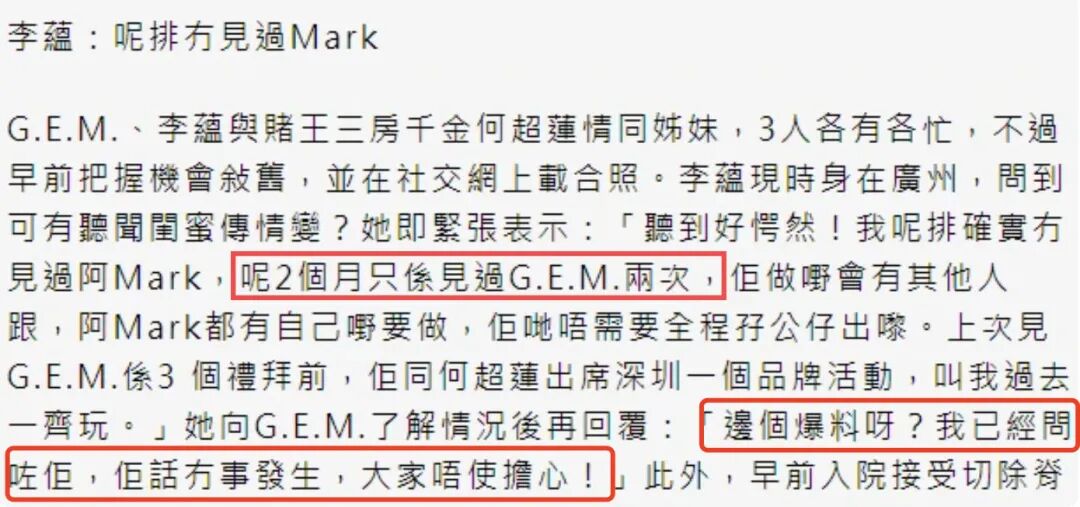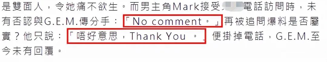 港媒这边联系了Mark,他的态度很……暧昧?对于外传的爆料并没有直接否认,只说“No comment”(无可奉告),再问下去,他只简单说了一句:“不好意思,Thank You”,就把电话挂了。可以说既没有承认也没有否认。