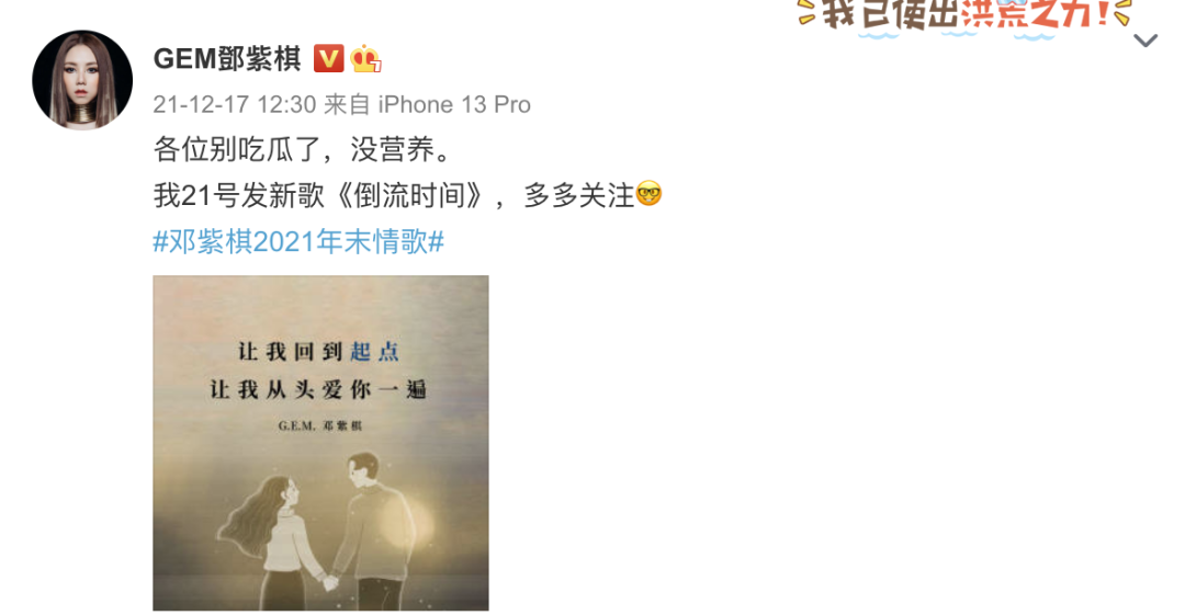 不过稍晚些时候,邓紫棋倒是发了微博,没有正面回应,只在宣传自己新歌的同时劝网友别吃瓜了。看这似是而非的态度,更像是俩人闹了别扭在冷战,还没有下定决心要分手的意思啊~你们怎么看?