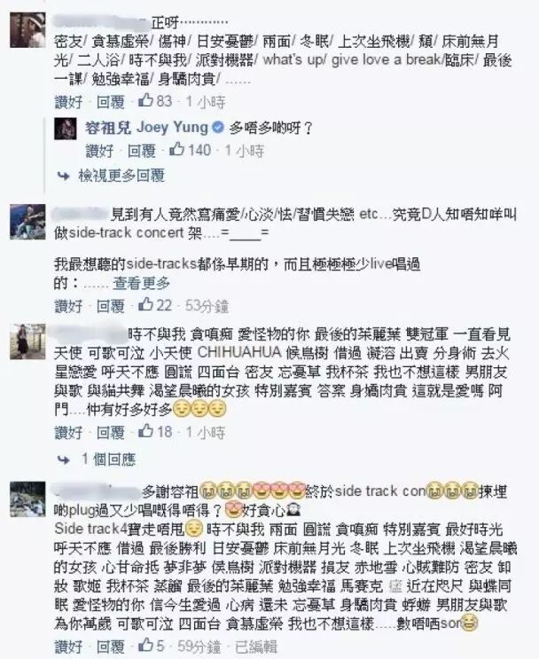 消息一出,短短一个钟浏览人次就破咗6万,粉丝们疯狂留言话想听容祖儿乜嘢嘅歌,个个都起手留言15首歌以上,啲歌名多到睇唔晒,容祖儿见到都唔知点拣,忍唔住要留言讲番句:「多唔多啲呀?」而有部份粉丝除咗提议容祖儿唱乜嘢歌之外,仲留言话想容祖儿快啲推出新专辑。
