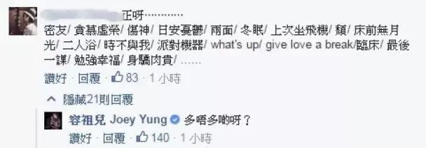讲起金句就会谂起黎明,但系除咗黎明仲有好多人都有金句,啱啱乐坛天后容祖儿就喺Facebook用「齐心就事成、齐心做事情」嚟宣布,喺出年头半年公司落实举行演唱会,容祖儿仲话想知道各位歌迷有乜嘢意见,希望歌迷们留言讲低想听嘅歌,欢迎大家投票心水选择,容祖儿临尾仲向「金句王」黎明致敬,学佢用食嘢嚟做结尾!