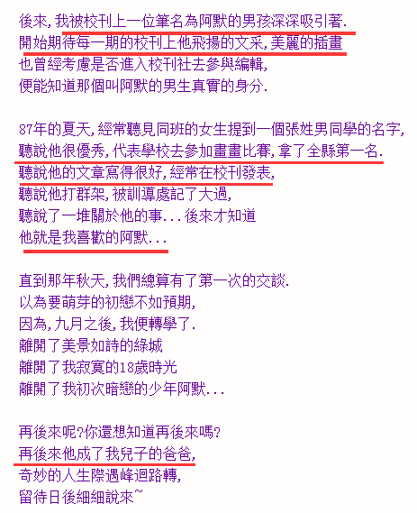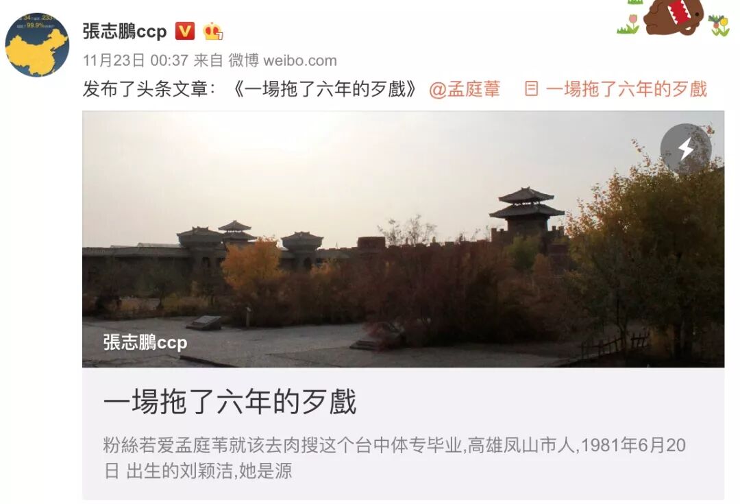 这是孟庭苇在2008年3月份在博客中写的一篇《我的初恋》,里面描写了她和张志鹏认识的过程,那年孟17岁,张16岁,纯纯的校园暗恋,而且是女恋男。在孟庭苇的描述中,张志鹏是个才子,又写文章又画画,还打群架,在学生时代这种男孩确实是很招女孩喜欢的。