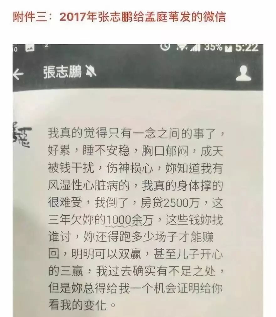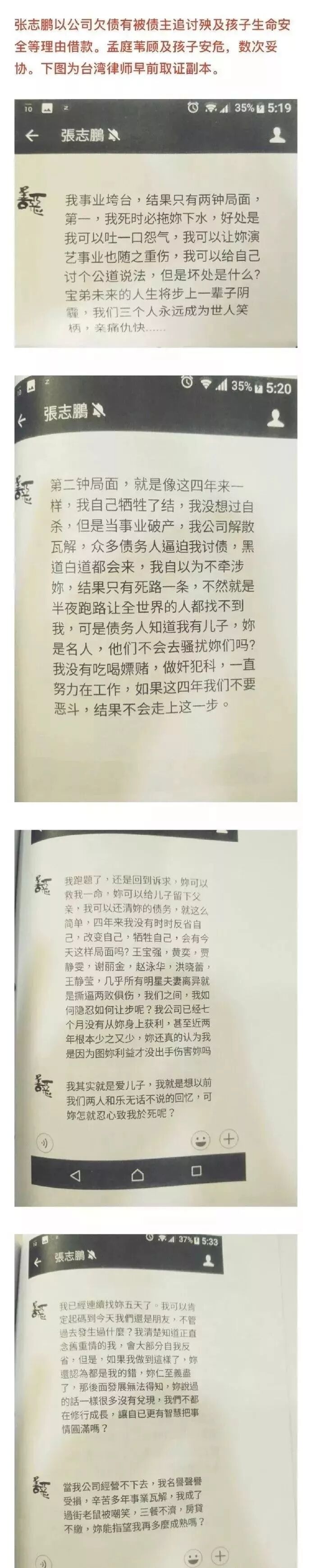 4、离婚一年后,孟提出要三七分(五五分太高),后来干脆不再愿意与前夫合作,而后来张志鹏则债台高垒,常常向前妻各种告借,一旦借贷不成,于是乎,便以前妻的隐私作为要胁。