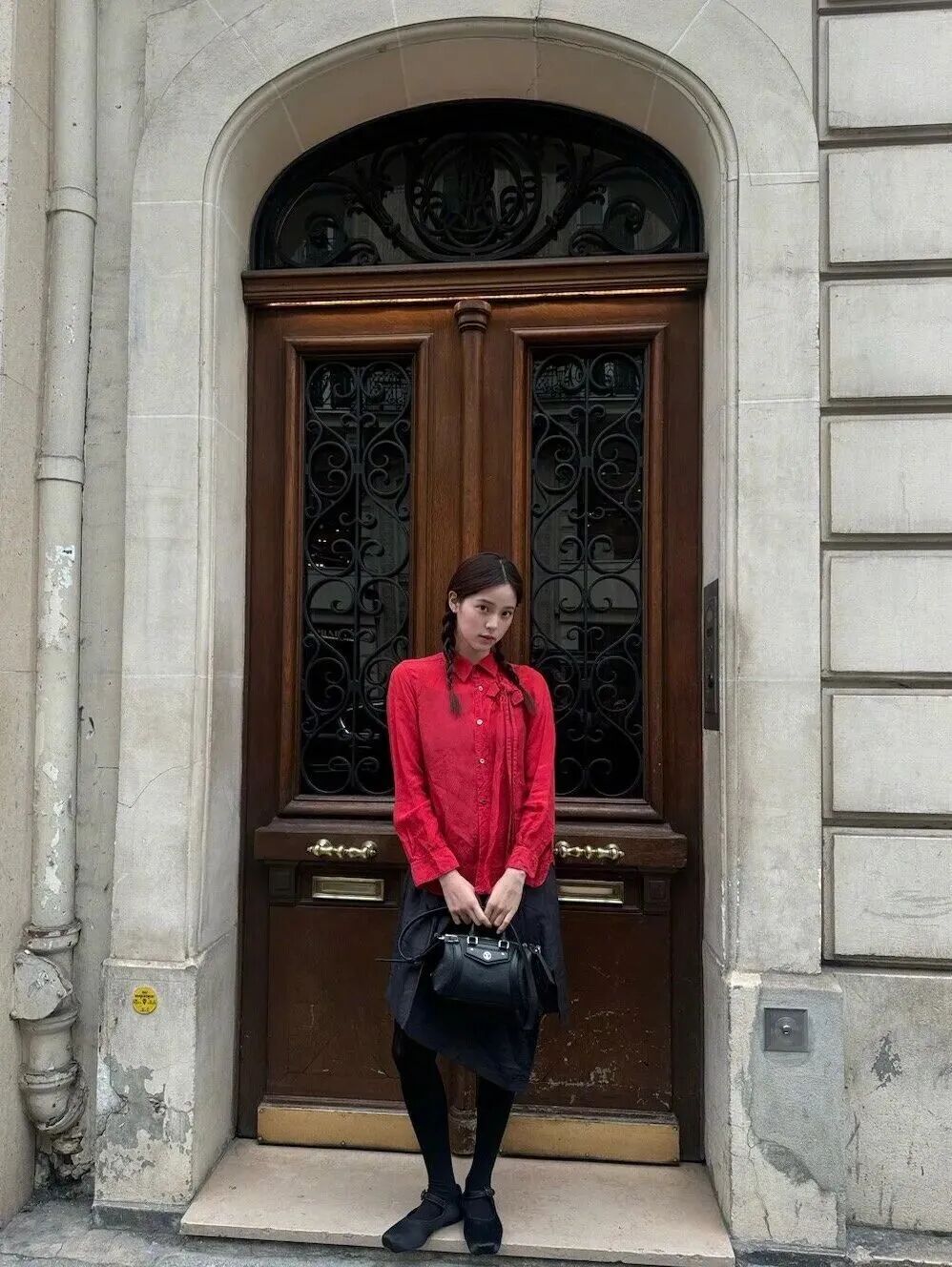 Gap year后她回到校园,clean fit、美高风、甚至小辣妹风都被她精准拿捏。一套极简的黑色唐装、盘扣衬衫搭直筒裙,再配珍珠耳环,温婉又沉静,简直是“古韵穿搭教科书”。