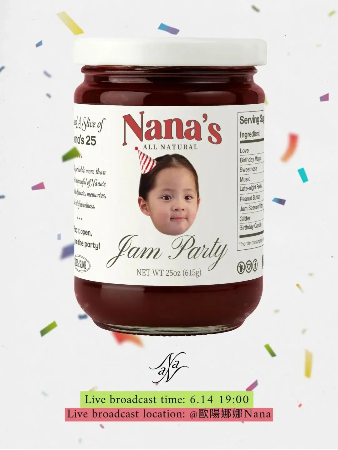 生日会也充满惊喜,果酱派对整体布置温柔又清新,从甜甜果酱色到梦幻复古设计,每个角落都审美在线。娜娜把自己的童年照做成果酱包装,“两岁娜娜果酱”复古又俏皮。