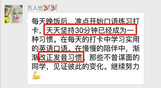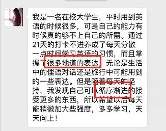 通过21天的打卡,不仅养成了学习习惯,还学到了口语知识,真是一举两得。(注意:打卡无需发朋友圈,不骚扰朋友,小程序打卡即可)