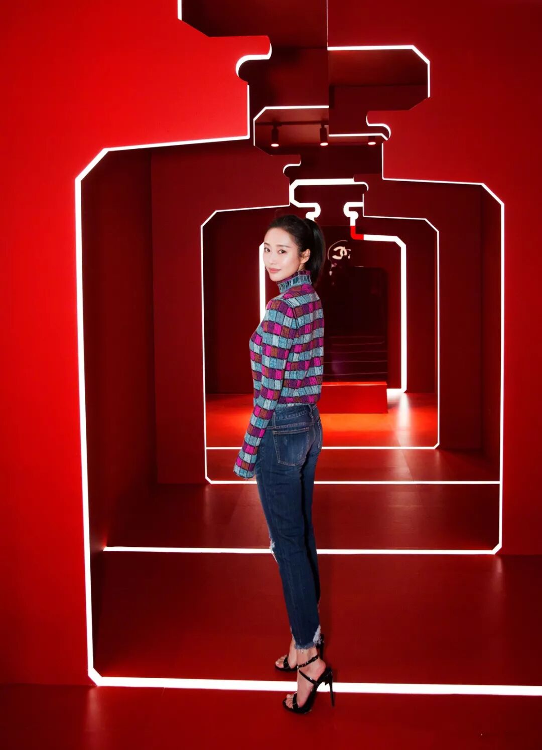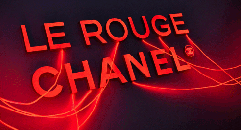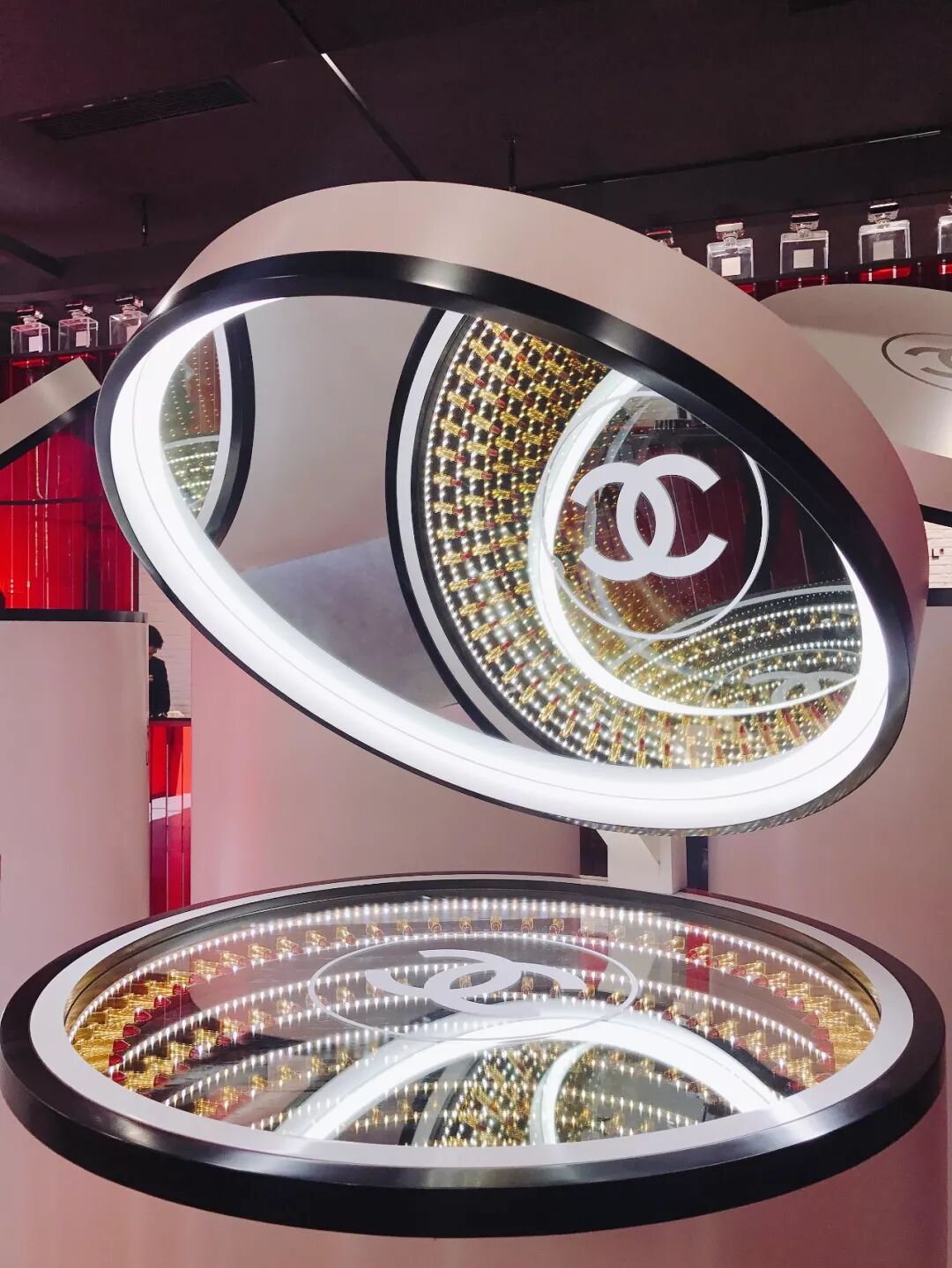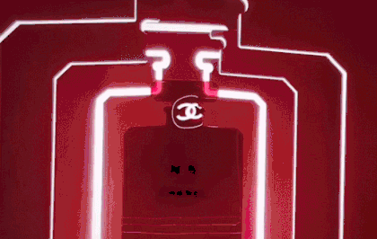 穿过精彩震撼的口红影像墙,来到香奈儿五号香水红廊,感受五号香水有棱格的「型」和红色之「色」。