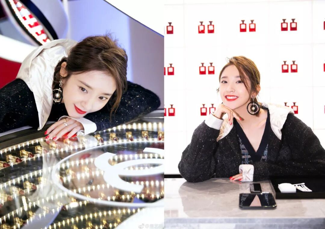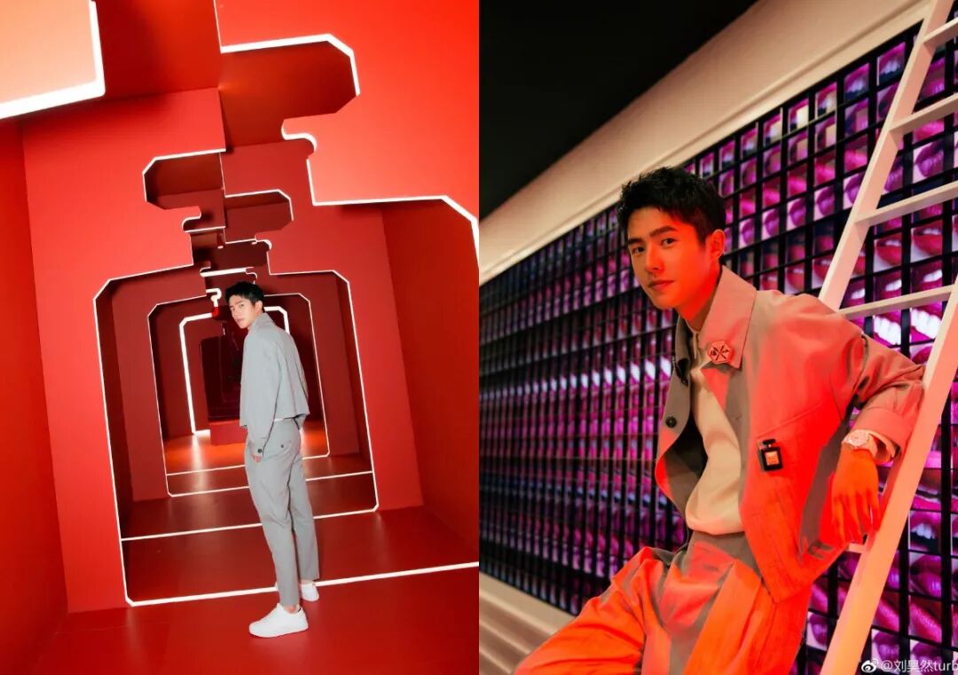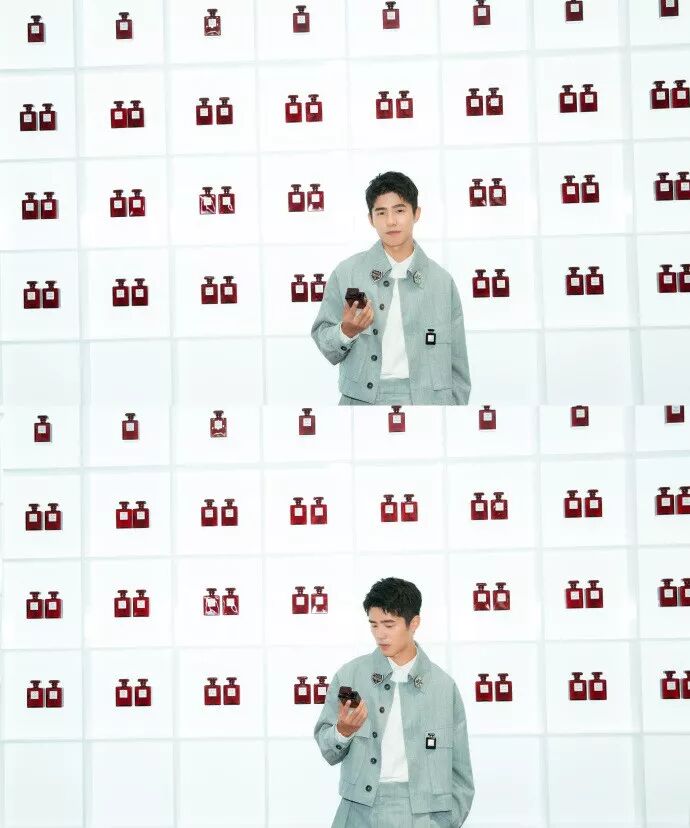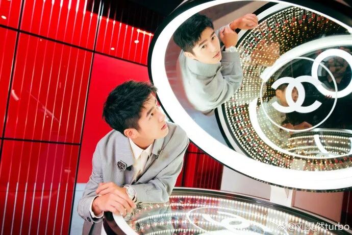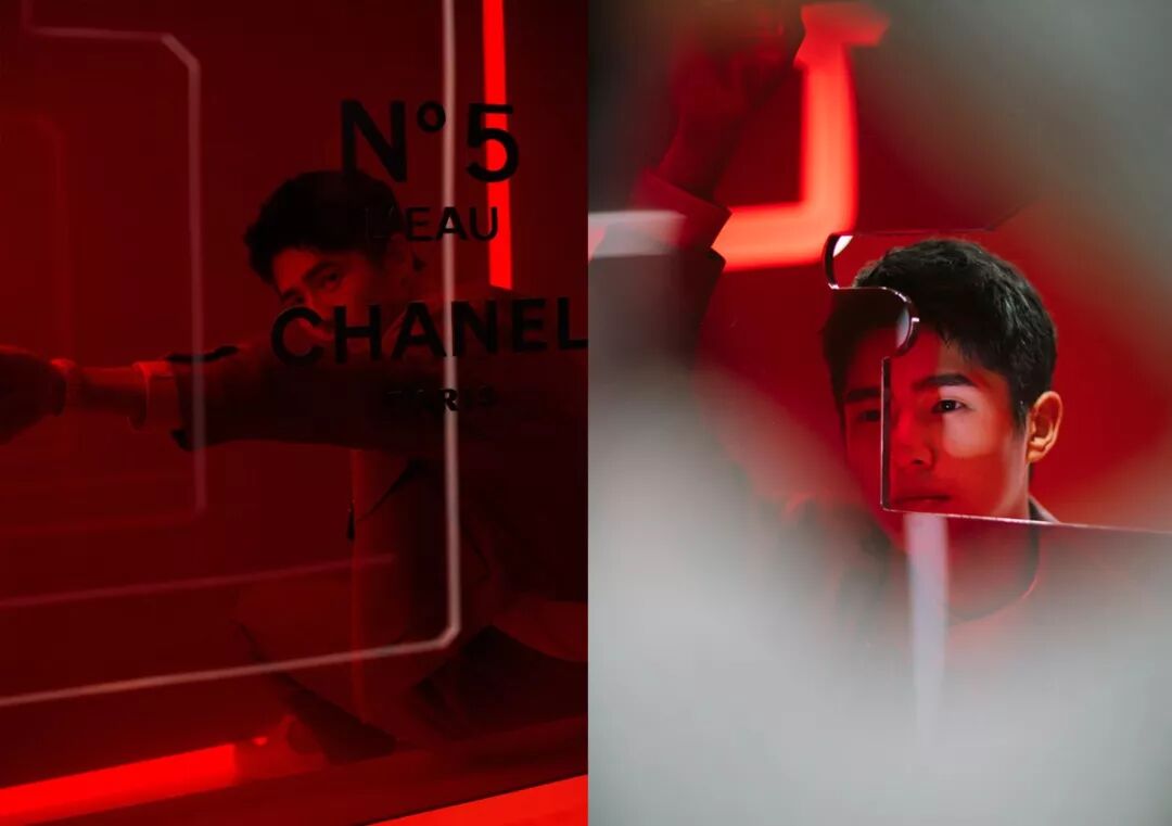 昊然弟弟身后是红色包装的限量版五号香水和五号之水,拥有传奇历史的香水和散发独特魅力的红色结合,颜值和实力兼备,昊然弟弟也是爱不释手呢!