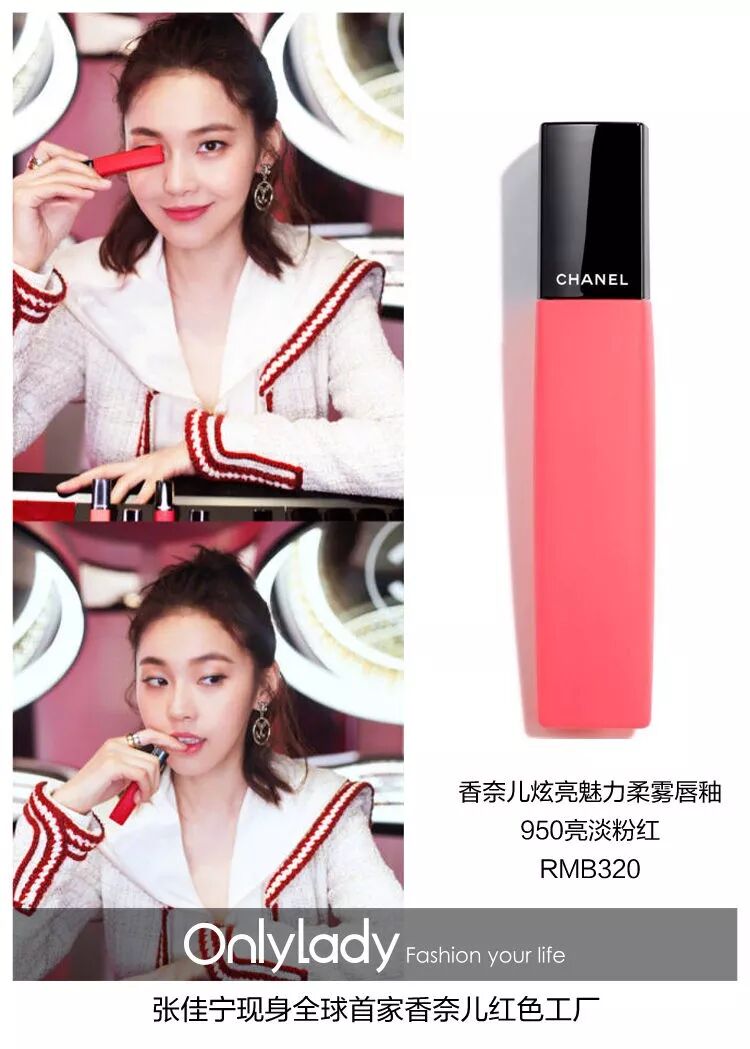张佳宁使用的是香奈儿炫亮魅力柔雾唇釉950亮淡粉红色,跟口红的互动也是很活泼可爱呢~