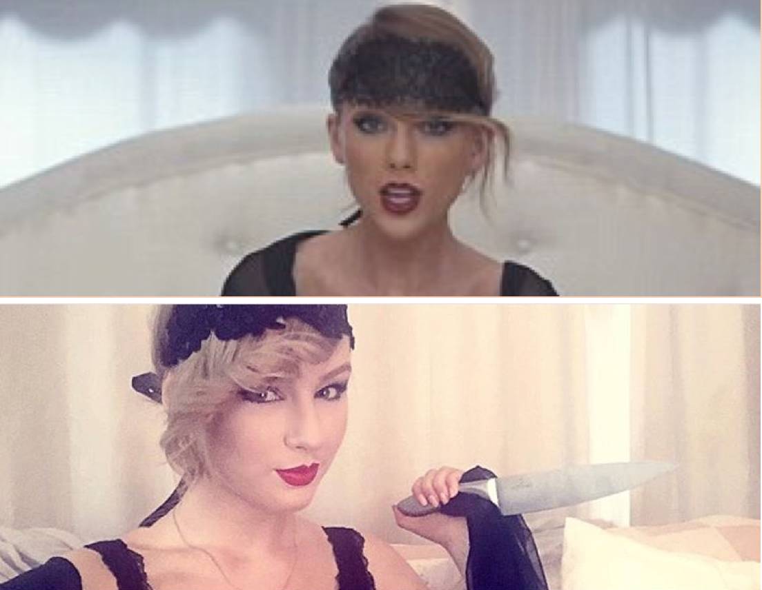 ▼甚至她还玩起了情景再现,模仿起了泰勒的著名MV Blank Space和Bad Blood
