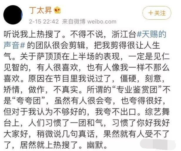 虽说最后,丁太升也为自己在节目中评价做出了解释,指责都是节目剪辑效果。