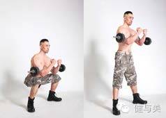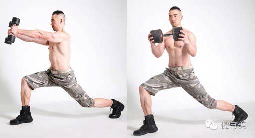 双手在身前持握住哑铃,双肘伸直;右腿向前迈出一大步,呈箭步蹲姿势;左膝向地面放低的同时,上半身向左侧旋转;返回初始姿势;换身体另一侧做同样的动作。