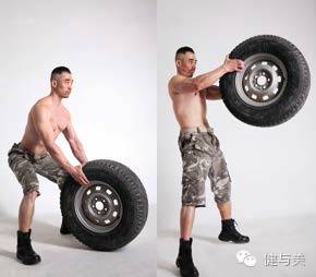 双手体前抓握住轮胎,躯干和髋关节保持正直,膝关节弯曲。双臂、腰部、髋关节发力,将轮胎摆动至体前。