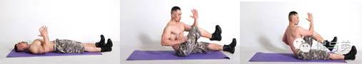 仰卧于地面,双腿伸直,双肘弯曲呈直角,放于身体两侧,双手掌心相对;做仰卧起坐动作的同时,抬起右膝,左肘触碰右膝,右肘向后摆动;身体向地面的方向放低;换身体另一侧做同样的动作。