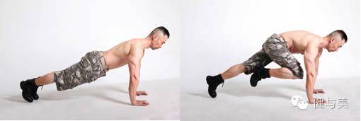 从俯卧撑的准备姿势开始做起,一条腿离地,膝关节不断向腹部靠拢,就好像在原地做全速登山动作;每侧身体做相同次数的单腿登山。