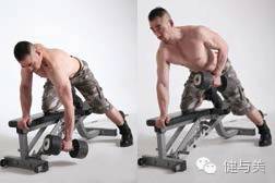 俯身,一只手握住哑铃,对侧手和膝盖在长凳上支撑身体,躯干尽量与地面平行,抬头挺胸;把哑铃尽可能放到最低,保持躯干不动,用背肌(而不是手臂)力量将哑铃拉到体侧;缓慢地放下,保持对重量的控制,换身体另一侧做同样动作。