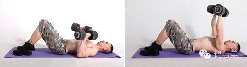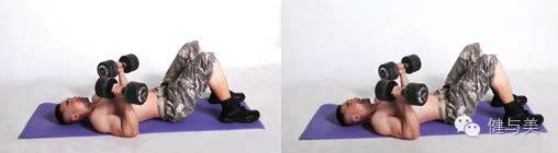 两手各握住一只哑铃,仰卧在地面上,双肘弯曲呈直角,双膝弯曲,双脚平放在地面上;双臂用力,将哑铃径直推向空中;双臂放低,返回初始位置,1次完整的动作就完成了。